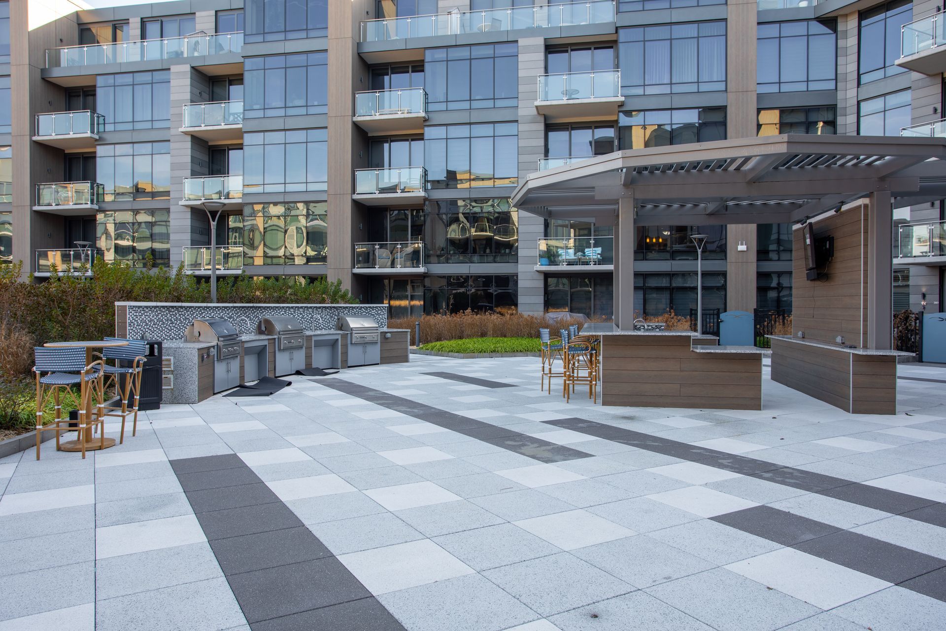 - Outdoor lounge area with fire pits and grills